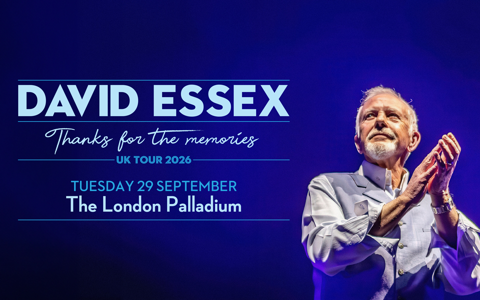 David Essex continues to break boundaries with his unique talent with his two previous two UK tours selling over 65,000 tickets across 39 dates, including shows at The London Palladium and Theatre Royal Drury Lane in London.